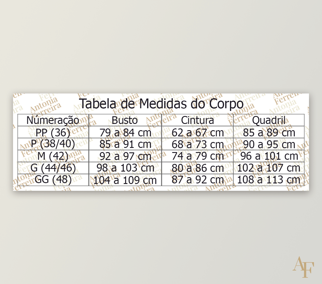 Para escolher corretamente o tamanho do molde, consulte a tabela de medidas disponível no arquivo. Como o molde segue o Método Antonia Ferreira, ele oferece padronização e mais segurança na escolha do tamanho ideal.